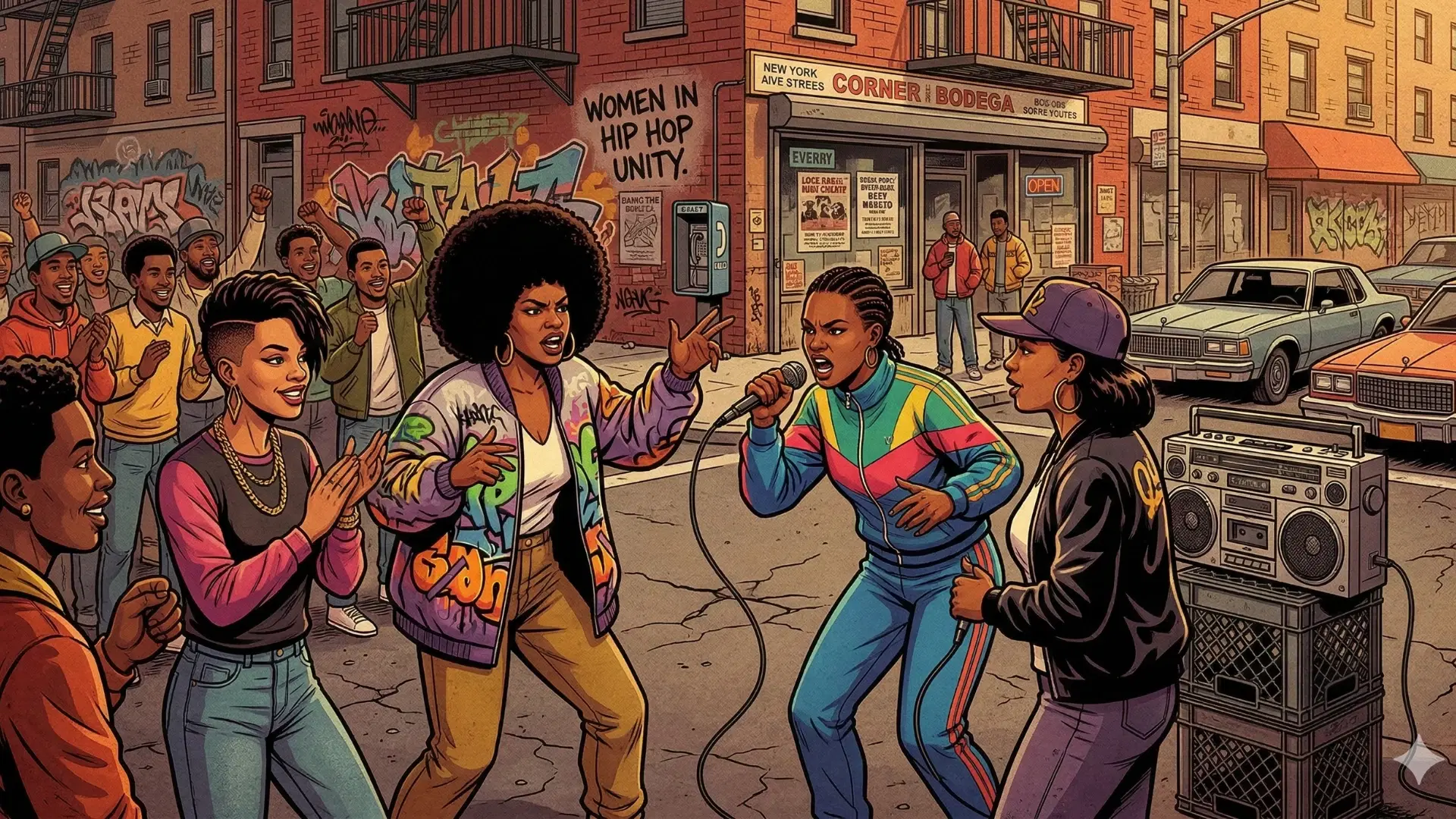 The hosts break down how women in hip hop have often been treated as extra to the crew, even though every early crew had at least one woman—usually a cousin, sister, or partner—holding it down as part of the core lineup.